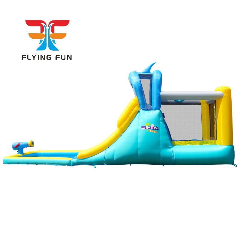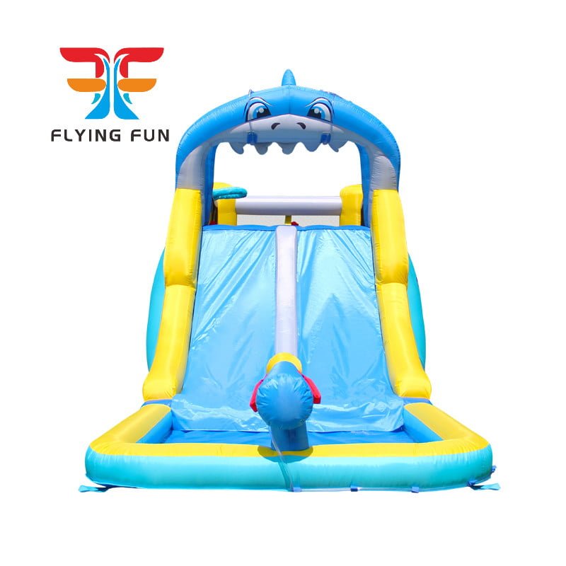Main Features: Bouncing Floor, Dual Water Sliding With Water Spray, Water Pool, Rock Climbing, Basketball Hoop, Shark Shape Splashing, Splashing Gun, Shark Theme Design.